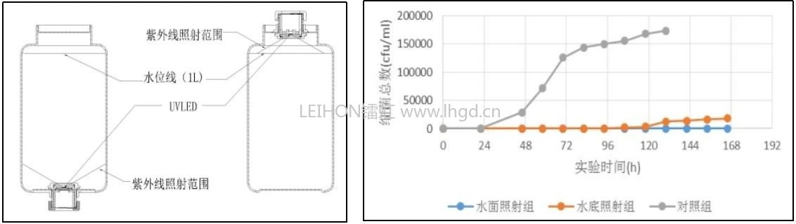 对于洁净水的抑菌应用,在UVC辐射功率、容器形状、水量均相同且光照无遮挡的情况下,光源从水面照射的抑菌效果要好于水底照射。原因是洁净水的细菌来源是空气和水的接触面,也就是水位线。水面照射的方式离“防线”更近,辐射强度更高,抑菌效果更好。